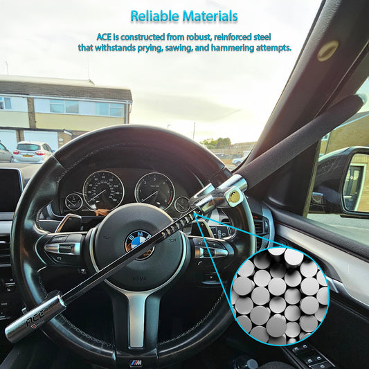 ACE Car Steering Wheel Lock, heavy-duty, adjustable, double hook steering lock with emergency exit