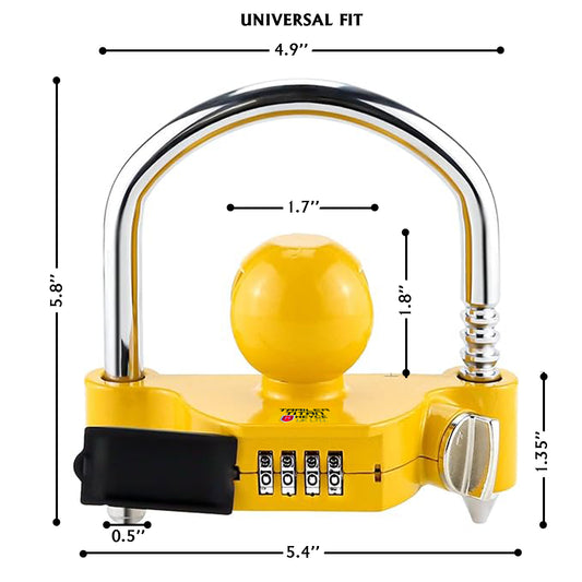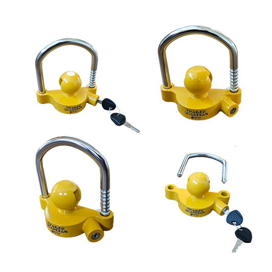 Trailer Guardian Universal Hitch Lock fits 50mm couplings, with an adjustable yellow ball lock.